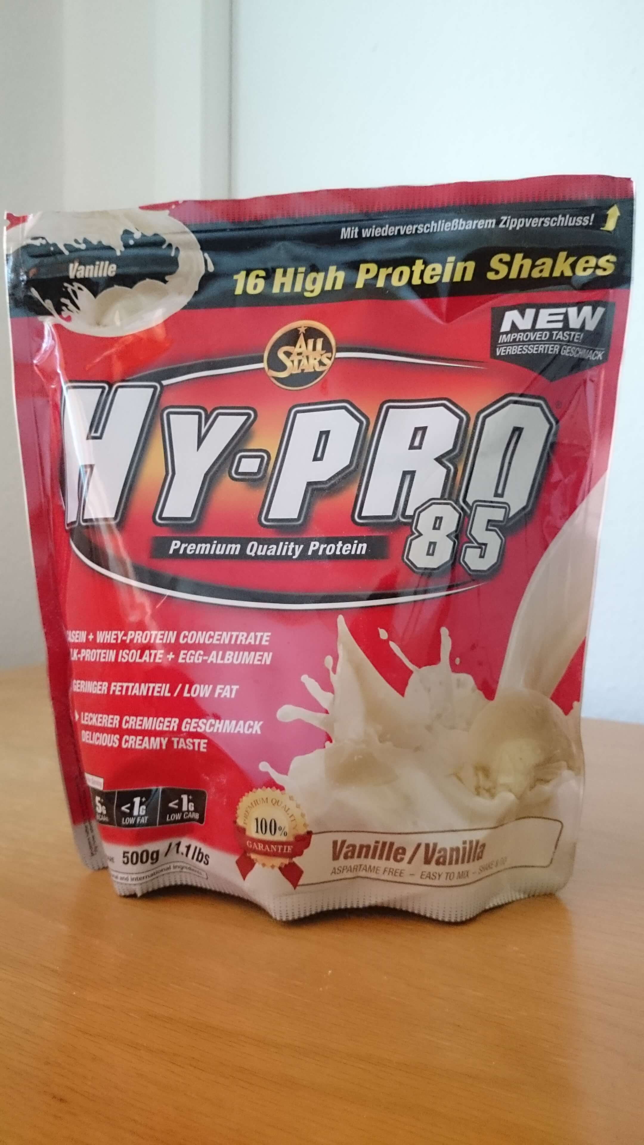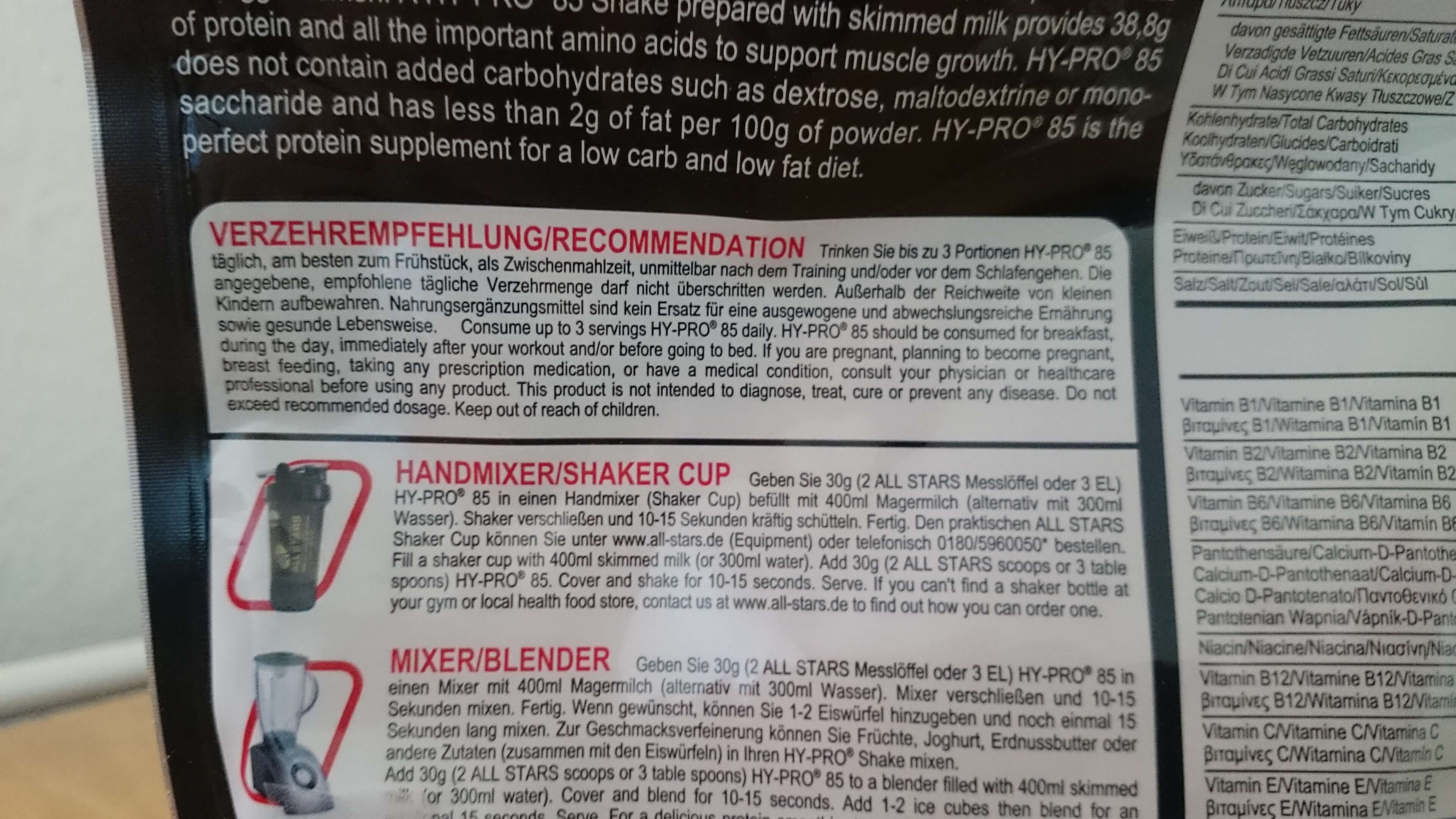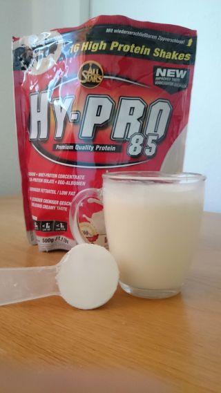 Dick auf der Verpackung steht Casein + Whey-Protein Concentrate, Milk-Protein Isolate + Egg- Albumen, alles richtig, nur leider in winzigen Anteilen. Also kann man hier Grunde von einem Molkenprotein sprechen. Darüber hinaus gibt es keine Angaben, welches Filtrierungsverfahren verwendet wurde und was das Aminosäurenprofil ist. Von den Nährwertangaben ist das Hy-Pro 85 unter allen getesteten All Stars Proteinpulver das Beste. Es hat den höchsten Proteingehalt und die niedrigsten Fett und Kohlenhydratwerte. Der Geschmack ist ebenfalls sehr gut gelungen.